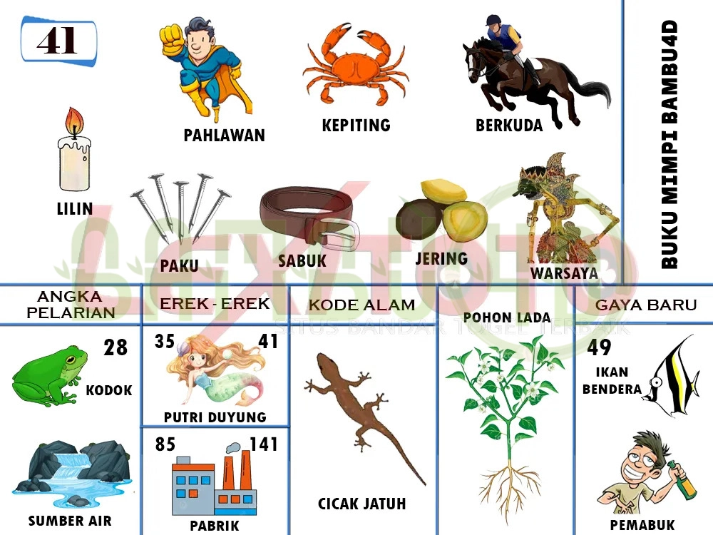 Selamat datang di Bambu4d, situs yang menyediakan buku mimpi terlengkap dan erek-erek untuk tafsiran mimpi togel. Kami memiliki buku mimpi dengan gambar yang memudahkan Anda untuk mencari tafsiran mimpi Anda. Dengan bantuan erek-erek yang kami sediakan, Anda dapat melihat angka-angka yang berhubungan dengan mimpi Anda. Buku mimpi kami akan membantu Anda dalam memprediksi angka yang mungkin keluar dalam permainan togel.